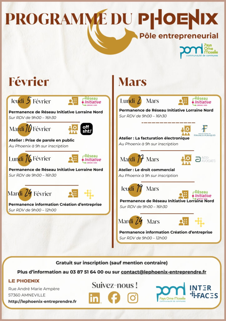 Le Phoenix, pôle entrepreneurial à Amnéville: la CCPOM propose pour ce 1er trimestre, un programme d’ateliers et de permanences dédié à la création et au développement d’entreprise.